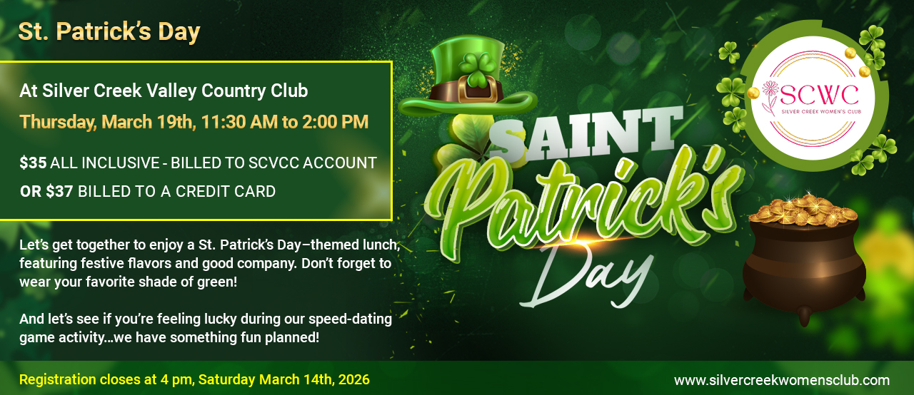 Let’s get together to enjoy a St. Patrick’s Day–themed lunch, featuring festive flavors and good company. Don’t forget to wear your favorite shade of green! 🍀